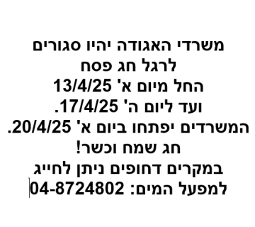 משרדנו יהיה סגורים מתאריך 17.07.25 ועד 20.07.25Bilidabush@gmail.com16/07/2025 תושבות/ים יקרות/ים, משרדי האגודה יהיו סגורים ביום ה' 17/7/25 וביום א' 20/7/25 ... קרא עוד