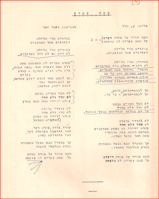 מילות השיר עם הדגשות של נעמי שמר (ארכיון נעמי שמר, הספרייה הלאומית)